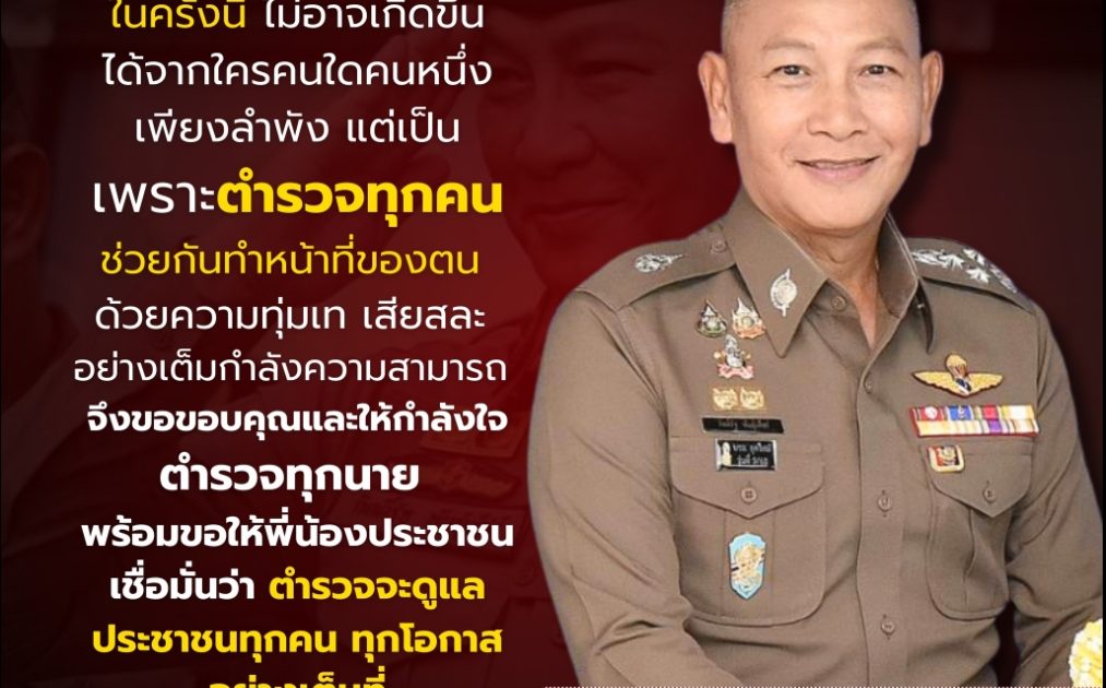 “ขอขอบคุณตำรวจทุกนายทั่วประเทศ ที่ร่วมแรงร่วมใจปฏิบัติหน้าที่ ดูแลความปลอดภัยและอำนวยความสะดวกการจราจรช่วงเทศกาลสงกรานต์ที่ผ่านมาอย่างเต็มกำลัง ทำให้ผลการปฏิบัติในภาพรวมเป็นที่น่าพอใจ”