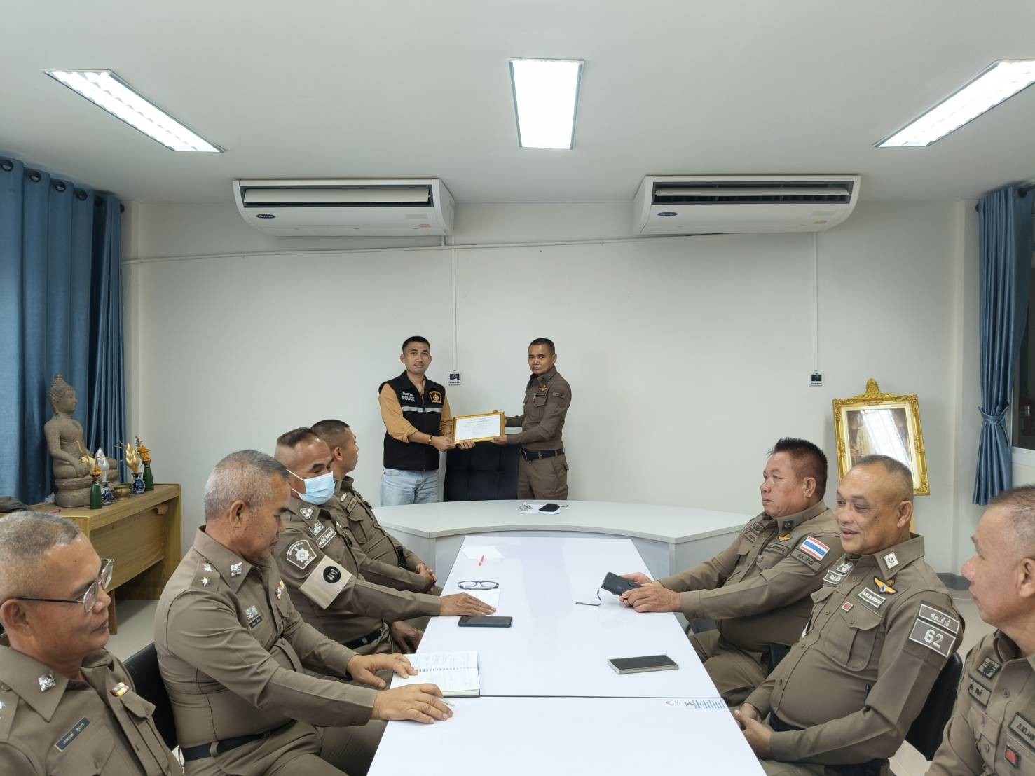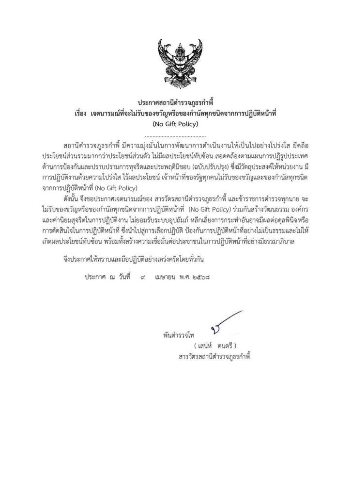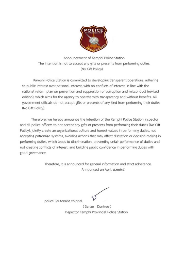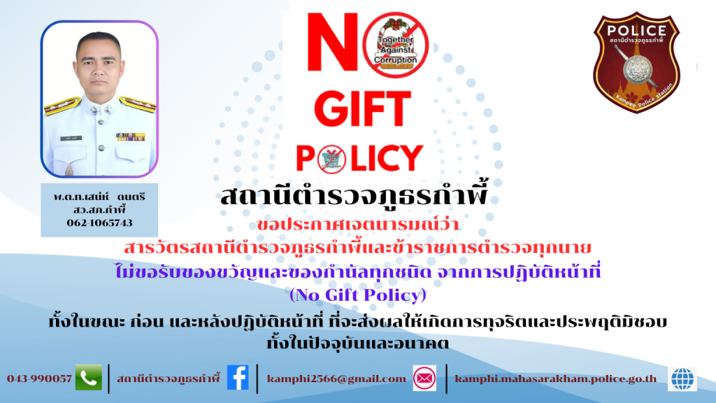 O14 ประกาศนโยบายต่อต้านการรับสินบน (Anti-Bribery Policy) และการมีส่วนร่วมของหัวหน้าสถานีตำรวจ 3 เมษายน 2026 โดย admin / ข่าวจัดซื้อจัดจ้าง ประกาศนโยบายต่อต้านการรับสินบน (Anti-Bribery Policy) ไฟล์ PDF ไฟล์ Word ไฟล์ PDF ไฟล์ Word อินโฟกราฟิกนโยบายไม่รับของขวัญและของกำนัลทุกชนิด (No Gift Police) จากการปฏิบัติหน้าที่ - แสดงภาพการเผยเเพร่ ณ จุดบริการ และจุดประชาสัมพันธ์ที่เห็นได้ชัดเจน การมีส่วนร่วมของหัวหน้าสถานีตำรวจ เดือนมกราคม 69 วันที่ 14 ม.ค.69 เวลา 10.00 น. พ.ต.ท.เสน่ห์ ดนตรี สว.สภ.กำพี้ ได้จัดประชุมประจำเดือนข้าราชการตำรวจ สภ.กำพี้ ทุกนาย โดยได้สั่งการและมอบหมายนโยบายของ ภ.จว.มหาสารคาม พร้อมกำชับนโยบายไม่รับของขวัญและของกำนัลทุกชนิด (No Gift Police) จากการปฏิบัติหน้าที่ เป็นไปด้วยความเรียบร้อย เดือนกุมภาพันธ์ 69 วันที่ 25 ก.พ.69 เวลา 11.00 น. พ.ต.ท.เสน่ห์ ดนตรี สว.สภ.กำพี้ ได้จัดประชุมประจำเดือนข้าราชการตำรวจ สภ.กำพี้ ทุกนาย พร้อมมอบประกาศเกียรติบัตรให้แก่ข้าราชการตำรวจในสังกัด ที่ปฏิบัติหน้าที่ดีเยี่ยมและได้รับคำชมจากประชาชนผู้ที่มาติดต่อราชการที่ สภ.กำพี้ เดือนเมษายน 69 วันที่ 8 เม.ย.69 เวลา 11.00 น. พ.ต.ท.เสน่ห์ ดนตรี สว.สภ.กำพี้ พร้อมด้วยคณะกรรมการตรวจสอบพัสดุ ได้ทำการนัดตรวจอุปกรณ์ของหลวง,ของใช้สำนักงาน เพื่อป้องกันการสูญหายของ สภ.กำพี้ การดำเนินงานเป็นไปด้วยความเรียบร้อย